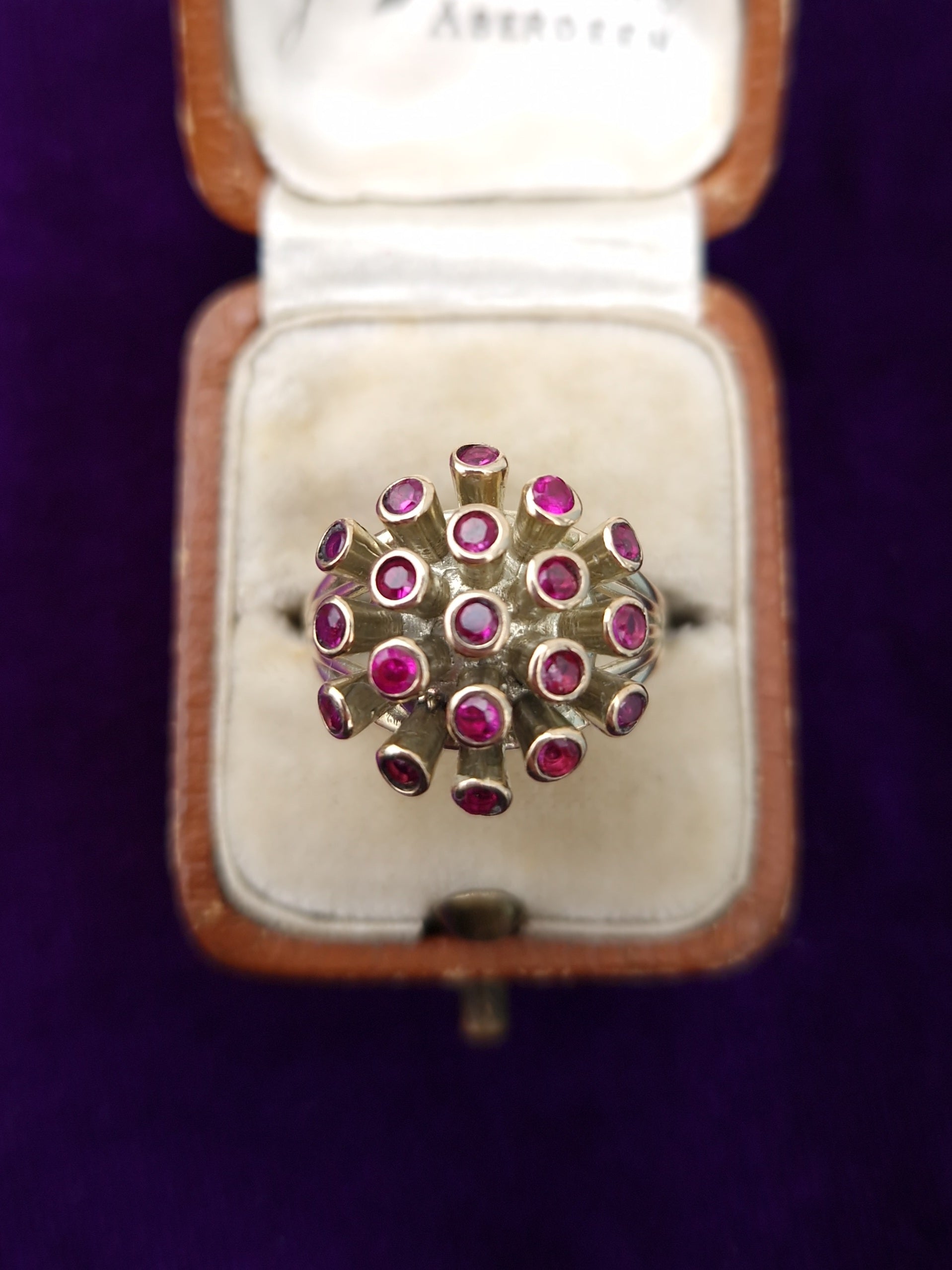 Eyecatching pre-loved 9ct gold sputnik style ring, set with 19 round cut rubies. The rubies are a beautiful deep pink/red colour, each set in a stylish tube setting.