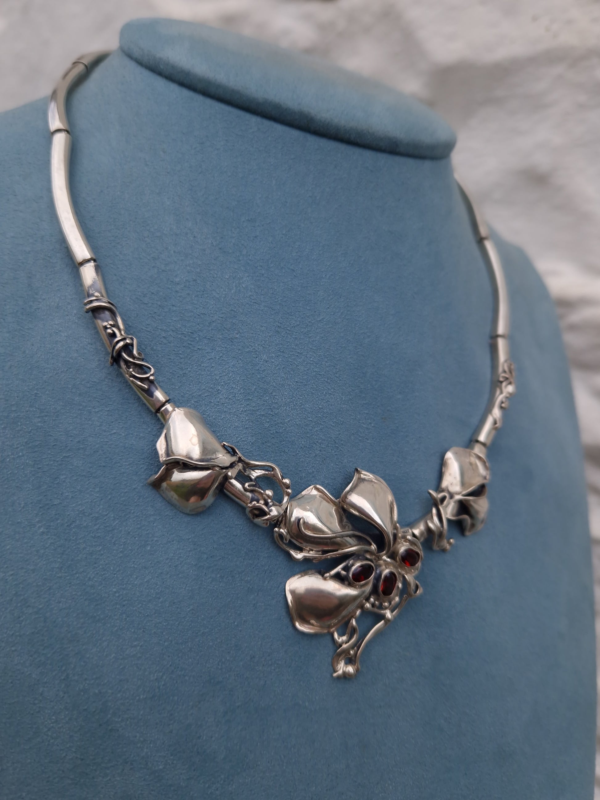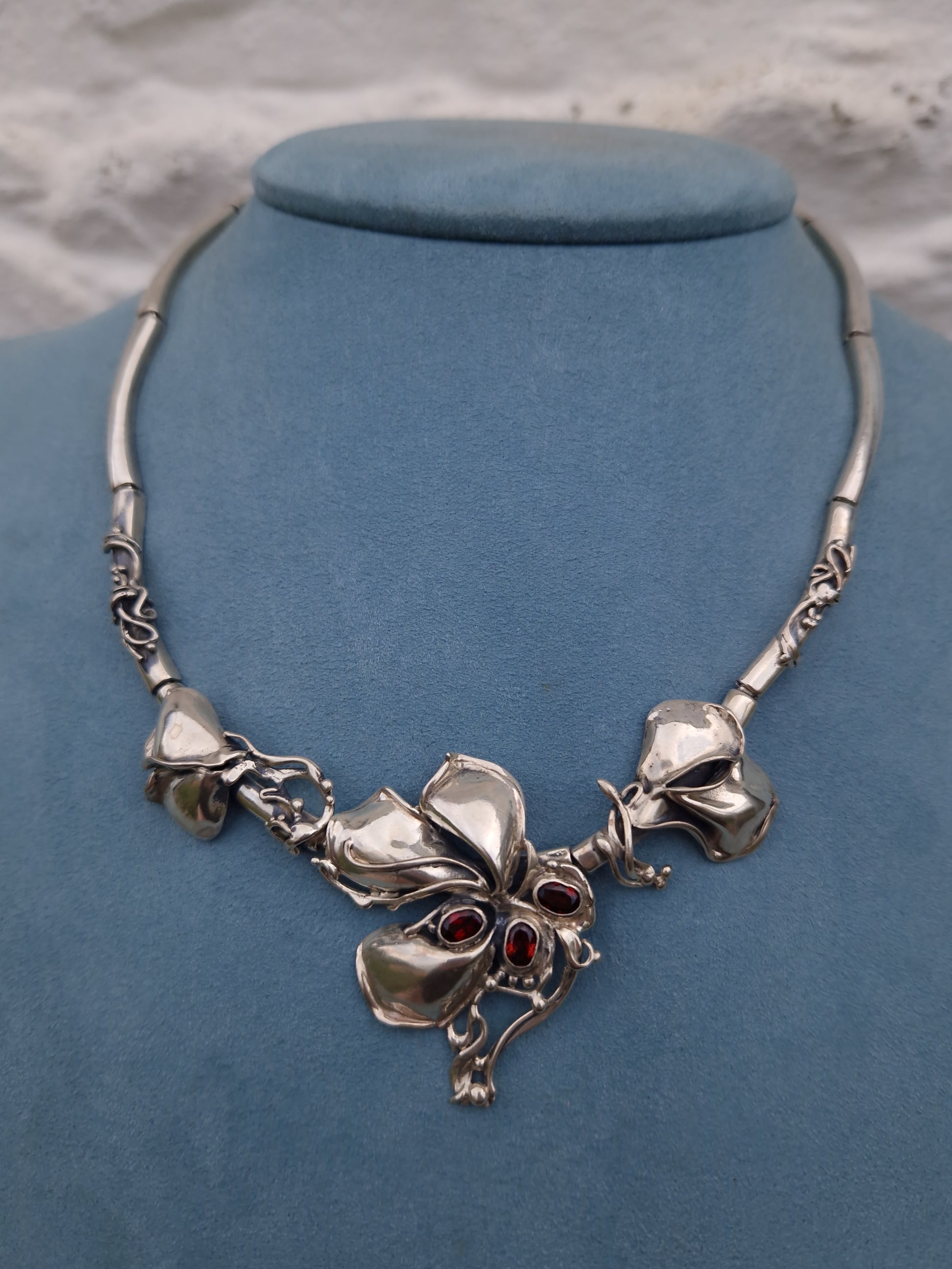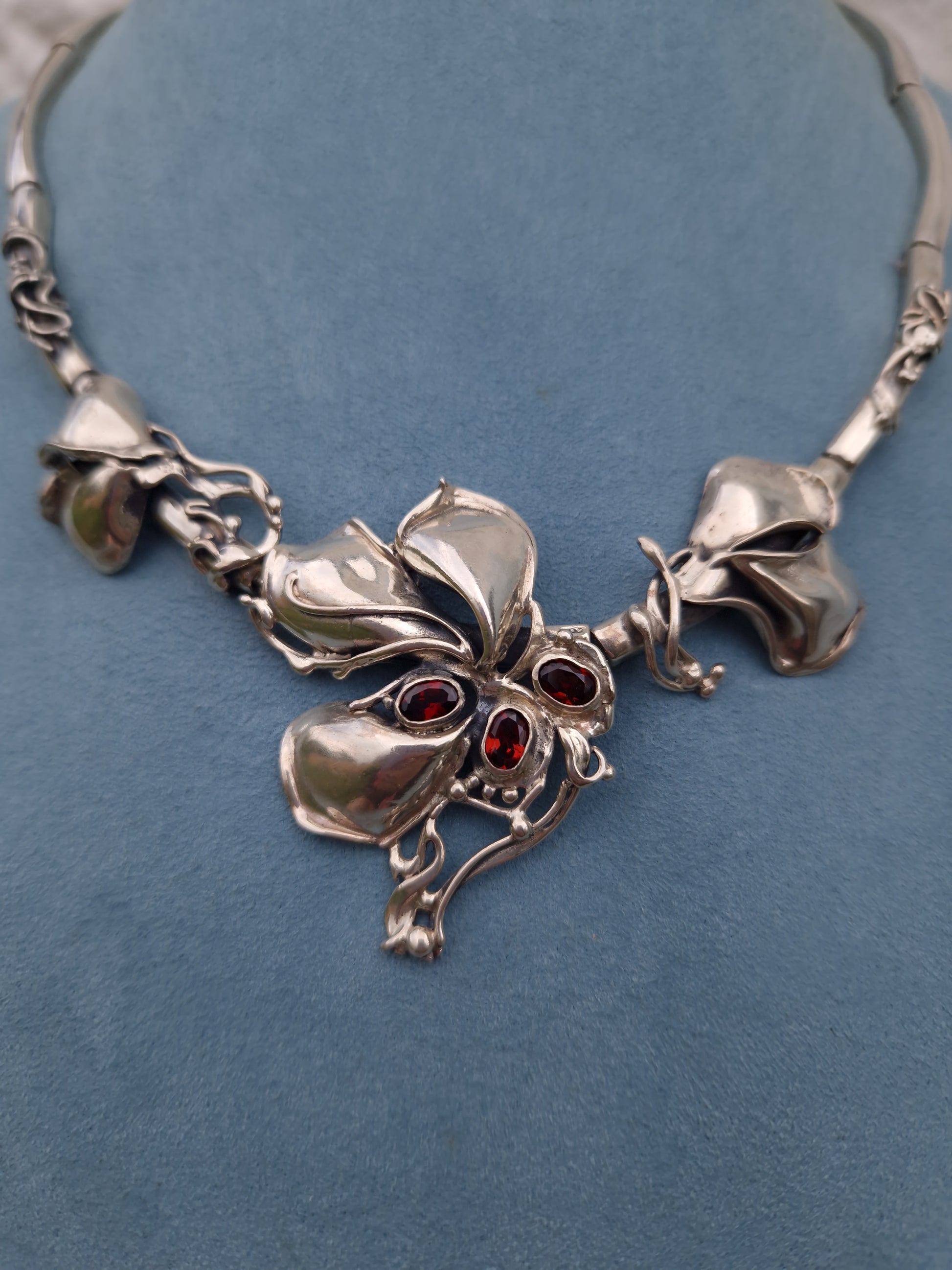 The necklace is bezel set with 3 oval cut spessartine garnet gemstones, amongst flower petals and sinuous, flowing whiplash lines, creating a sense of movement and elegance.