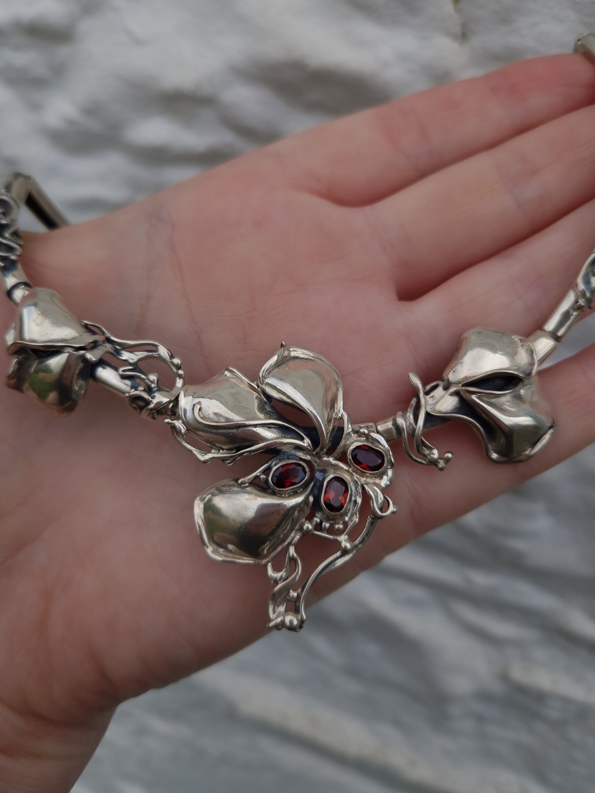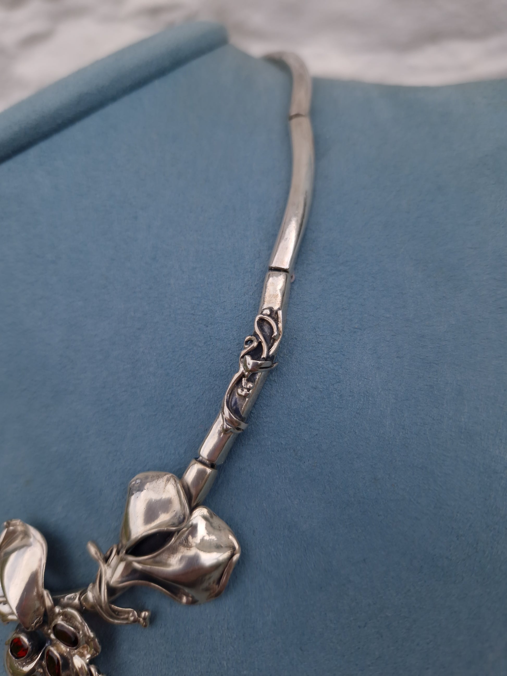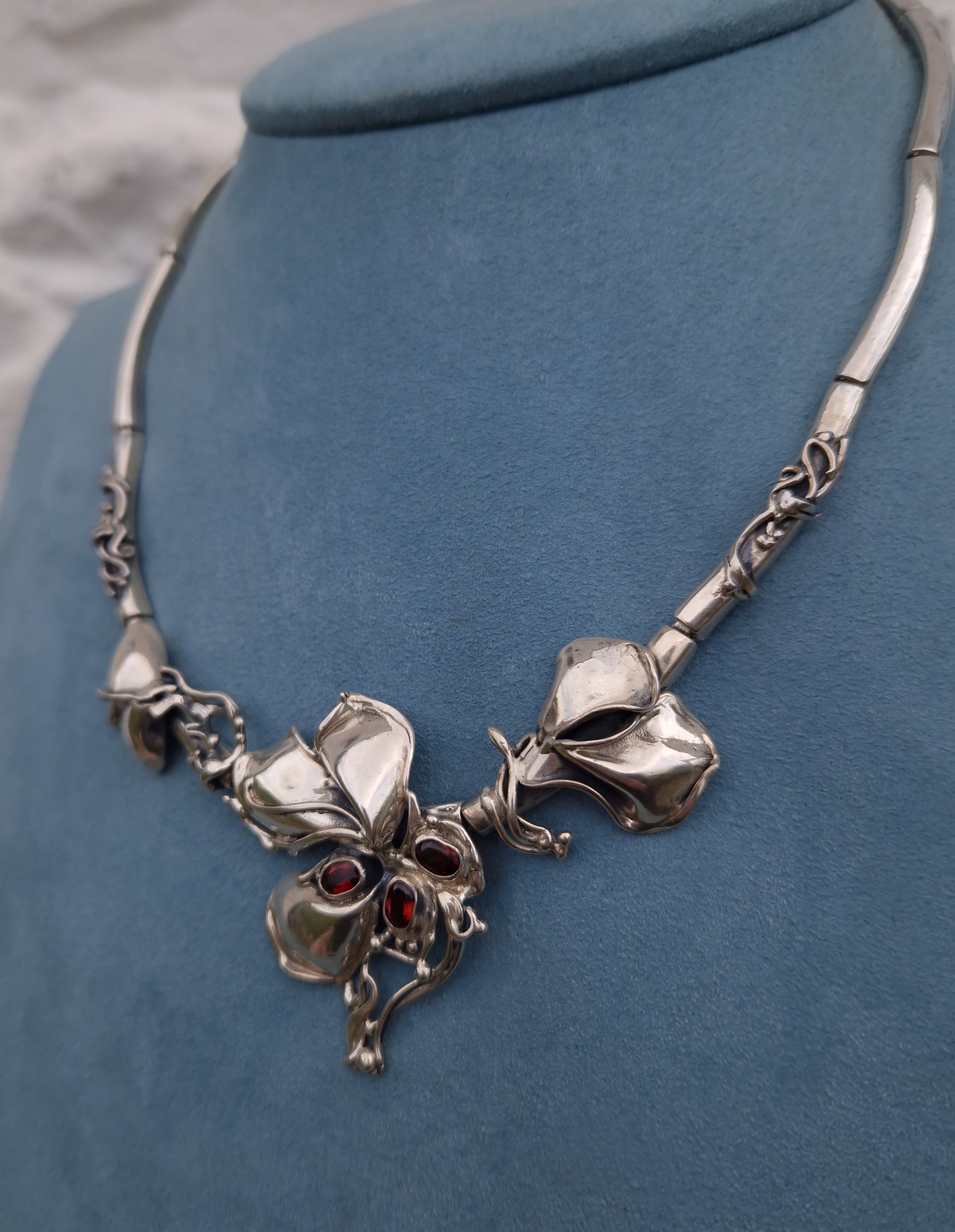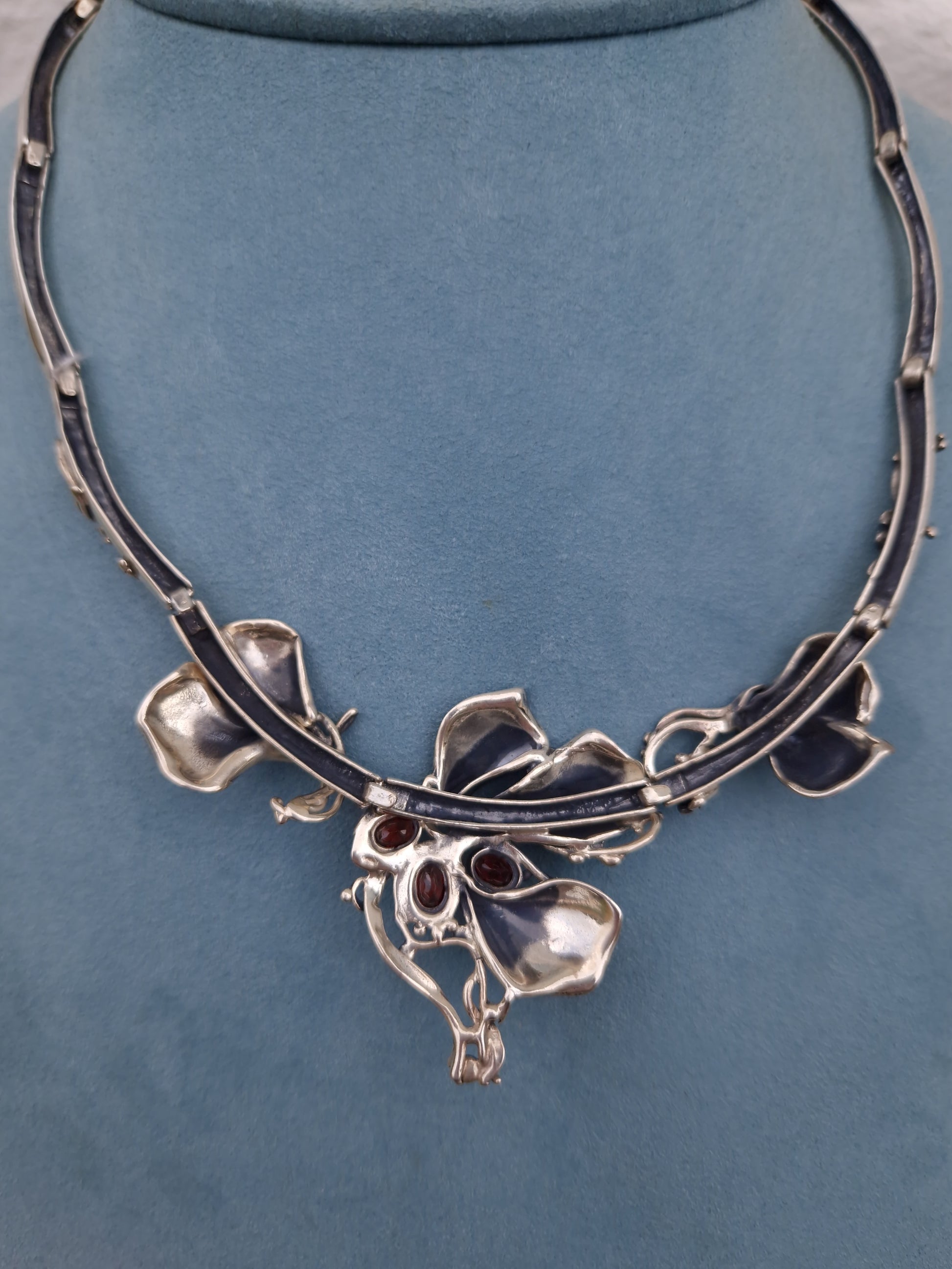 The necklace is bezel set with 3 oval cut spessartine garnet gemstones, amongst flower petals and sinuous, flowing whiplash lines, creating a sense of movement and elegance.