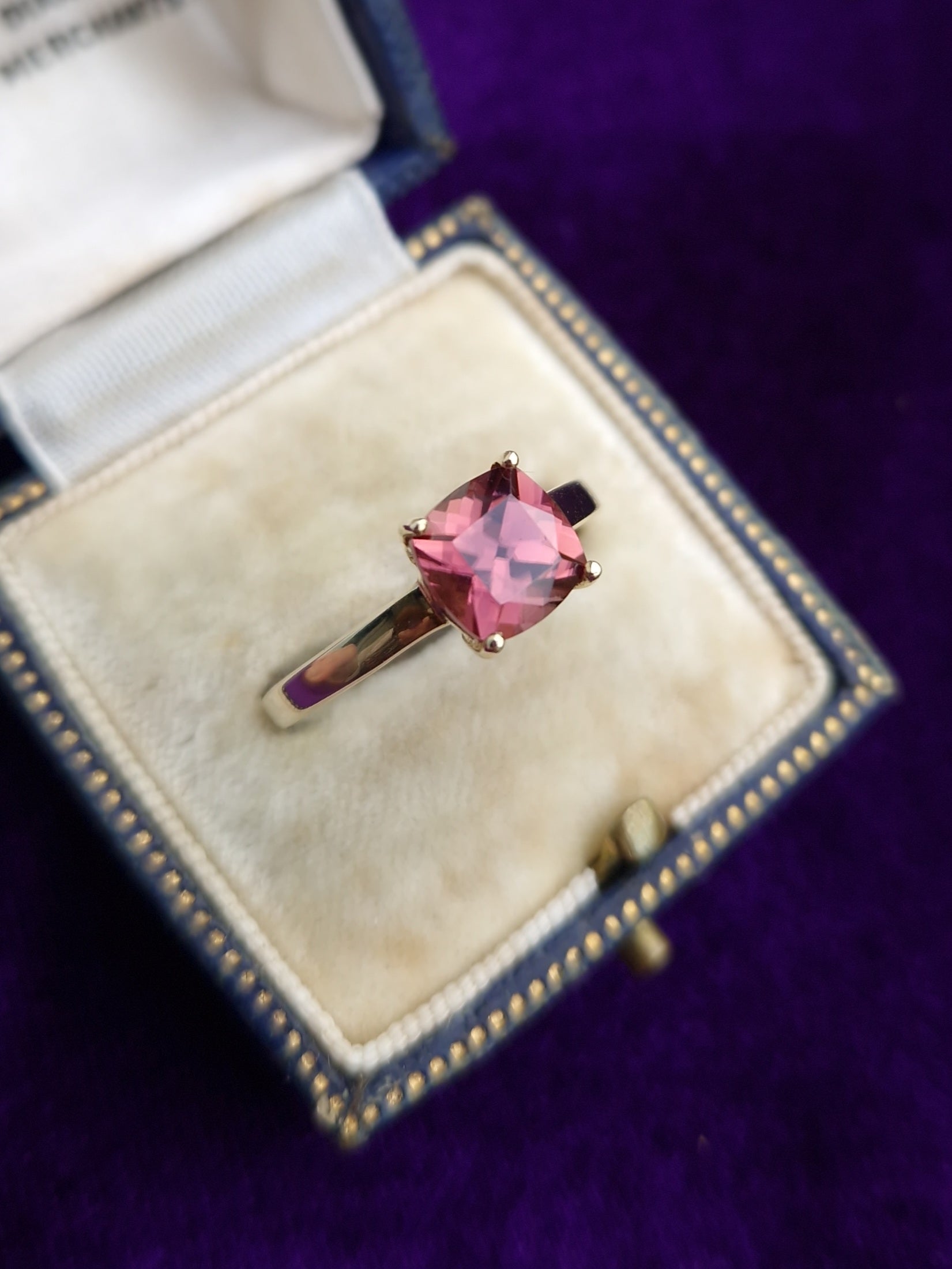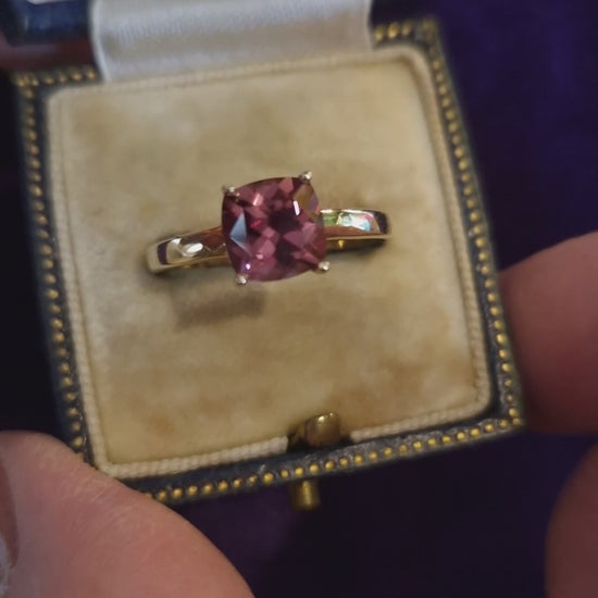 Pre-loved 9ct yellow gold solitaire ring, claw set with a sparkling cushion cut natural zircon gemstone.
